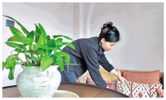 民宿工作人员正在整理房间。 曹小娟 摄