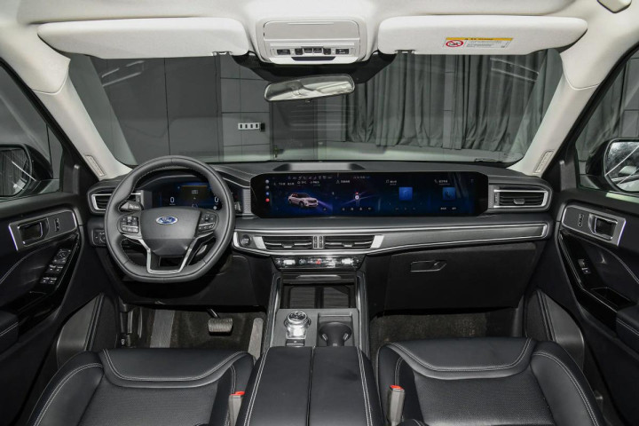 坐进2025款福特探险者的前排,内饰给人的感觉是简洁且规整。中控台采用对称式布局,没有过多复杂的线条,大部分功能都被整合进了那块27英寸的大屏里,分辨率达到4032x756,像素密度152PPI,显示效果比较细腻,操作起来响应速度也跟得上,这得益于它搭载的高通骁龙8155芯片和SYNC车载智能系统。屏幕下方保留了常用的实体按键,比如音量调节和空调开关,盲操起来比较顺手。手机互联方面,它支持CarPlay,连接过程比较稳定,日常听歌导航都能搞定。方向盘是皮质包裹的,尺寸适中,支持上下和前后调节,握感厚实,上面集成了多功能按键和换挡拨片,还有加热功能,冬天用着会比较舒服。换挡机构采用电子式旋钮,造型小巧,刚开始可能需要适应一下,但熟悉之后操作起来挺方便。音响方面,它配备了6个扬声器,虽然没有品牌加持,但音质表现比较均衡,应对日常听歌看视频足够了。
